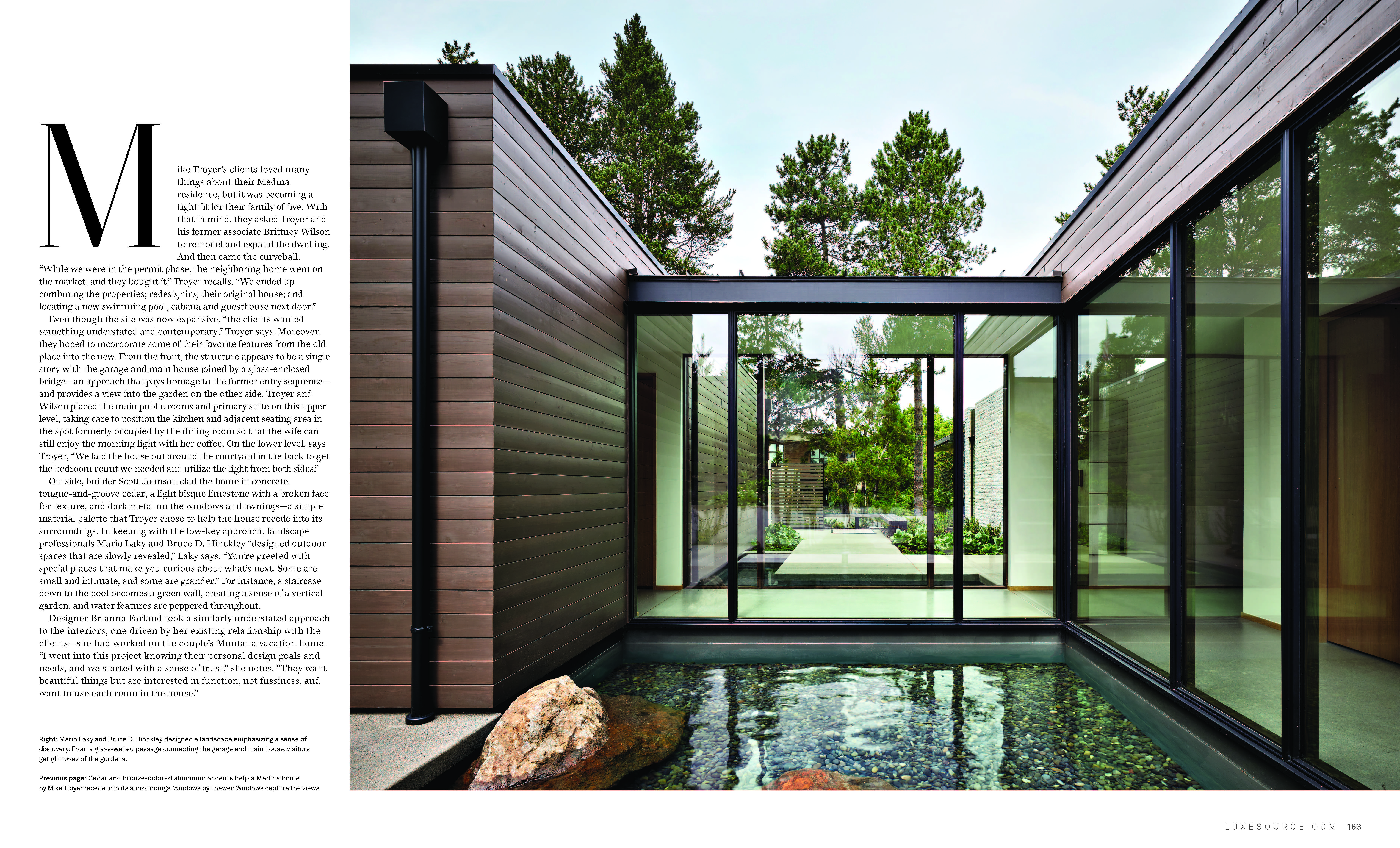 Mike Troyer’s clients loved many things about their Medina residence, but it was becoming a tight fit for their family of five. With that in mind, they asked Troyer and his former associate Brittney Wilson to remodel and expand the dwelling. And then came the curveball: “While we were in the permit phase, the neighboring home went on the market, and they bought it,” Troyer recalls. “We ended up combining the properties; redesigning their original house; and locating a new swimming pool, cabana and guesthouse next door.”