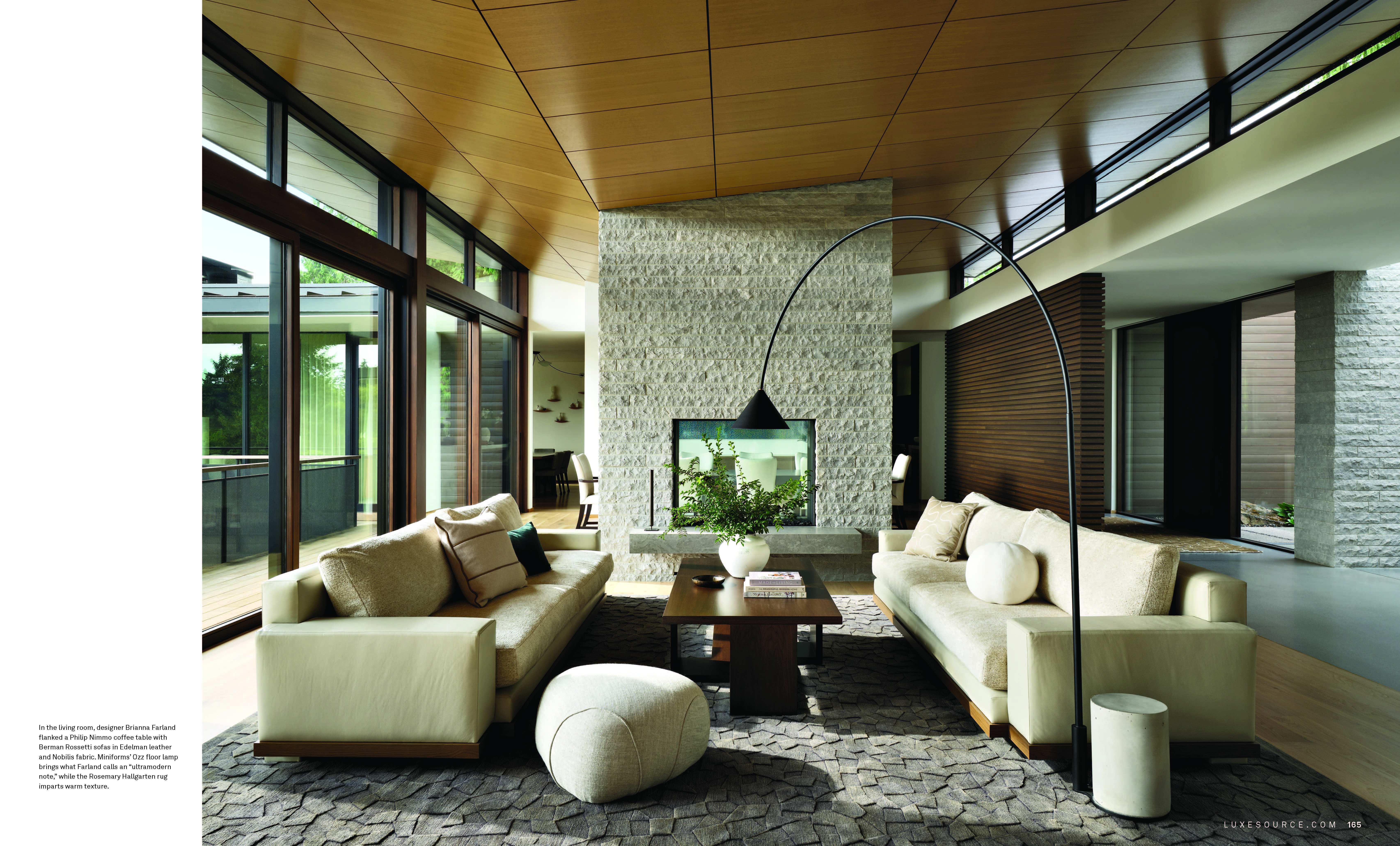 Top: Farland covered the family room’s custom sectional and lounge chair in Verellen and Pollack fabrics, respectively. The floor lamp is by Allied Maker, and the coffee table is from Dos Gallos.