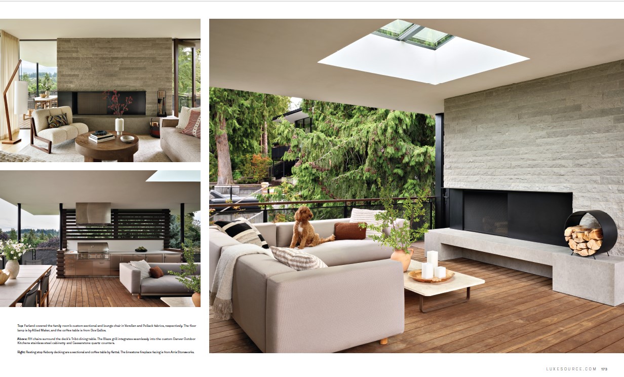 Above: RH chairs surround the deck’s Tribù dining table. The Blaze grill integrates seamlessly into the custom Danver Outdoor Kitchens stainless steel cabinetry and Caesarstone quartz counters.