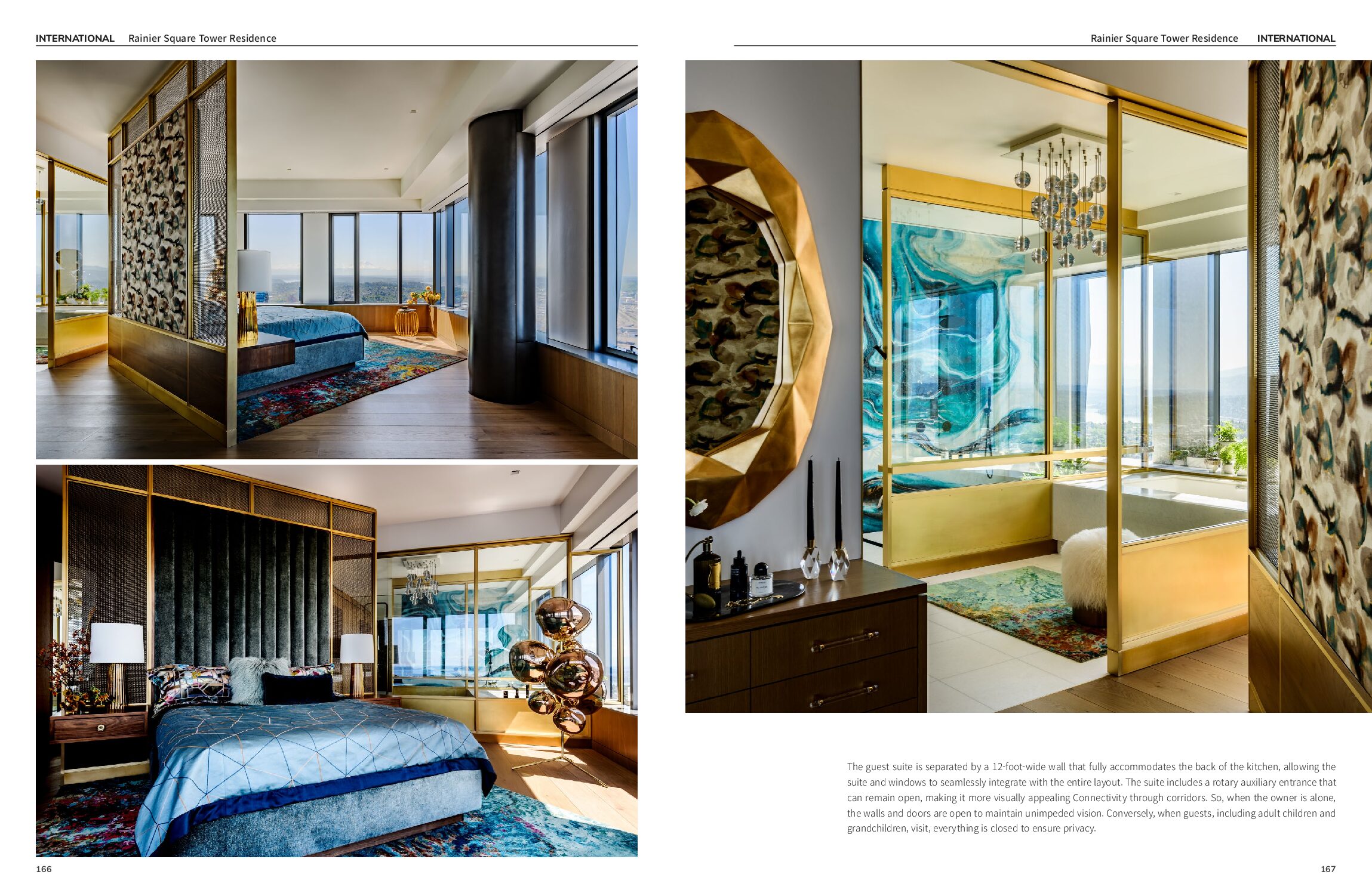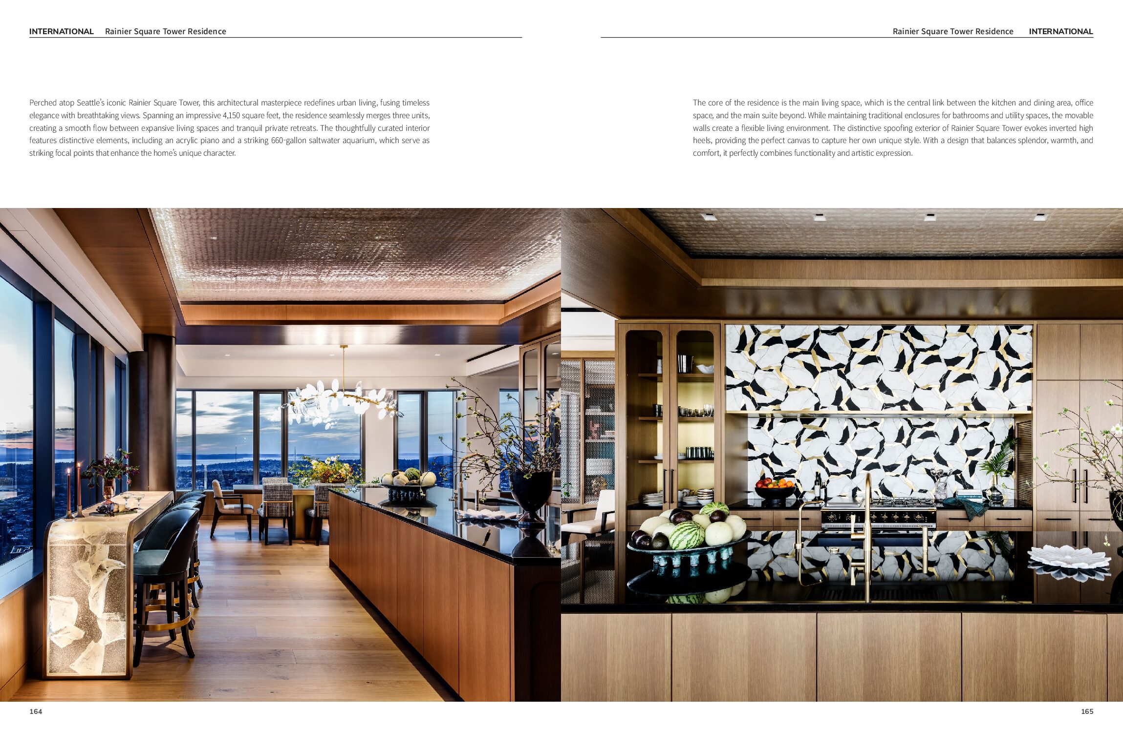 The core of the residence is the main living space, which is the central link between the kitchen and dining area, office space, and the main suite beyond. While maintaining traditional enclosures for bathrooms and utility spaces, the movable walls create a flexible living environment. The distinctive spoofing exterior of Rainier Square Tower evokes inverted high heels, providing the perfect canvas to capture her own unique style. With a design that balances splendor, warmth, and comfort, it perfectly combines functionality and artistic expression.